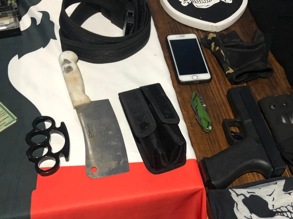 No imóvel foram encontradas bandeiras, gravuras dos ditadores Adolf Hitler, da Alemanha, e Benito Mussolini, da Itália, além de facas, canivetes e uma arma de fogo falsa.