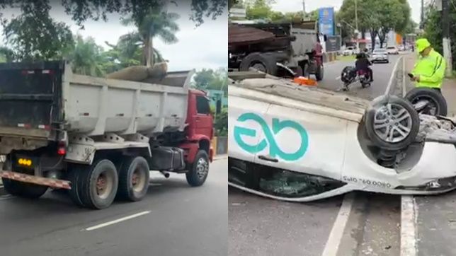 Um carro da Empresa Águas de Manaus capotou na manhã desta quinta-feira, 8, ao colidir com uma caçamba na Avenida Dr. Theomário Pinto da Costa, próximo à Bola das Letras no bairro da Chapada, Zona Centro-Sul de Manaus.