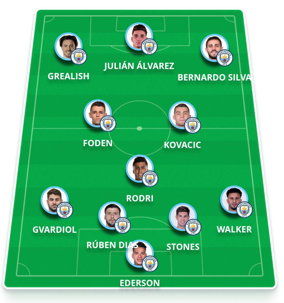 Provável escalação do Manchester City: Ederson, Walker, Stones, Rúben Dias e Aké (Gvardiol); Rodri, Kovacic e Foden; Bernardo Silva, Grealish e Julián Álvarez.