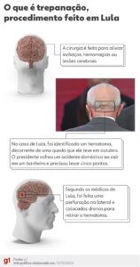 Após apresentar dores de cabeça nos últimos dias, ele procurou ajuda médica e passou por exames, que constataram um sangramento entre o cérebro e a membrana meníngea (que reveste o órgão). Nesta terça-feira (10), o hospital Sírio Libanês confirmou que Lula foi submetido a um procedimento chamado trepanação.