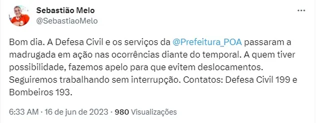 “A quem tiver possibilidade, fazemos apelo para que evitem deslocamentos”, publicou o prefeito de Porto Alegre em suas redes sociais.