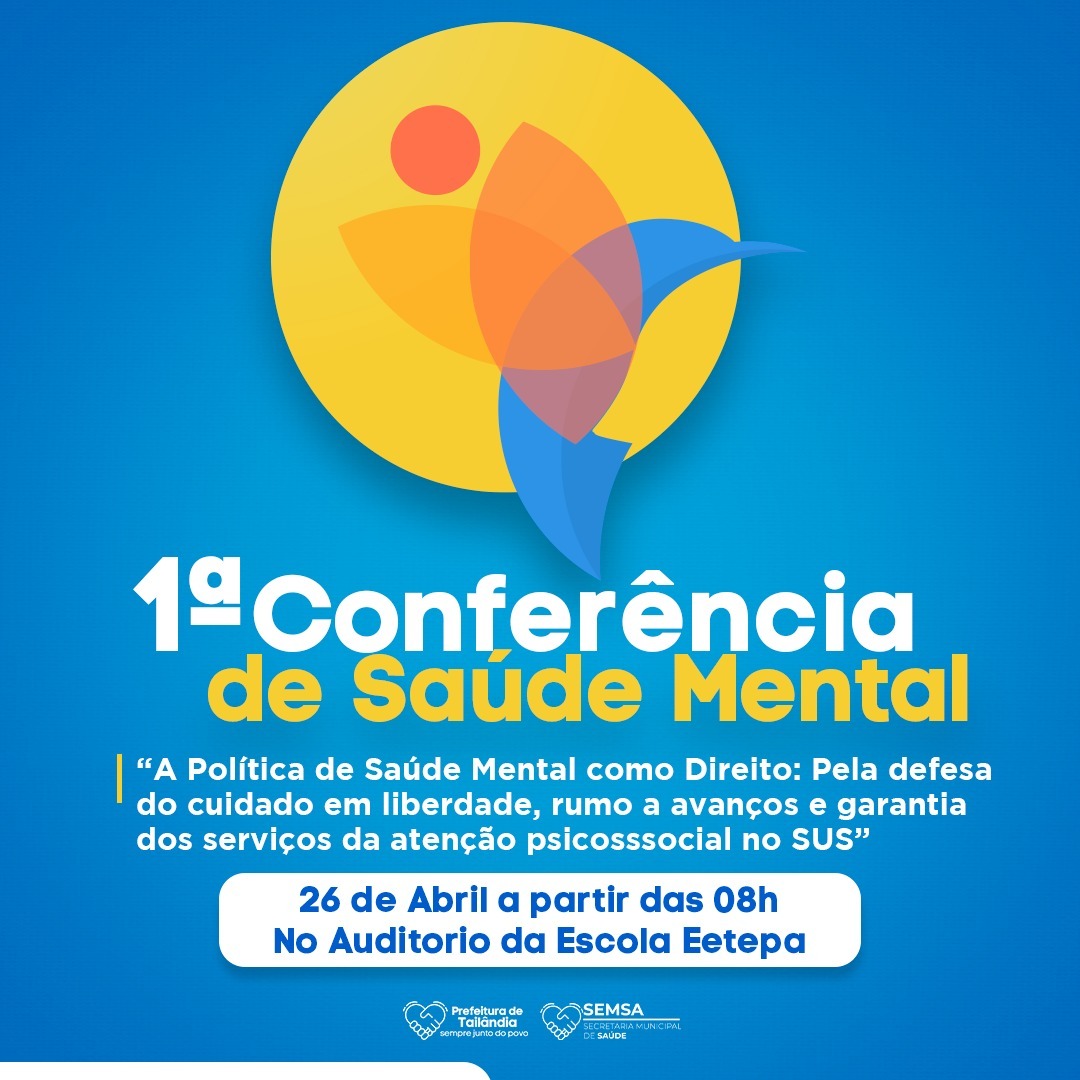 A Secretaria Municipal de Saúde (SEMSA), realizará a 1ª Conferência de Saúde Mental na próxima terça-feira, 26 de abril a partir das 8hrs no auditório da escola EETEPA. Com o tema “A Política de Saúde Mental como Direito: Pela defesa do cuidado em liberdade, rumo a avanços e garantia dos serviços da atenção psicossocial no SUS“.