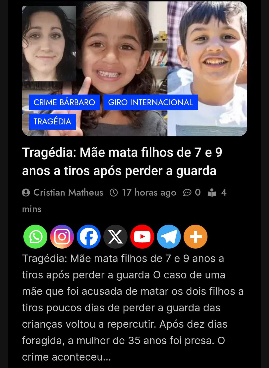 Veja Também: Tragédia: Mãe mata filhos de 7 e 9 anos a tiros após perder a guarda