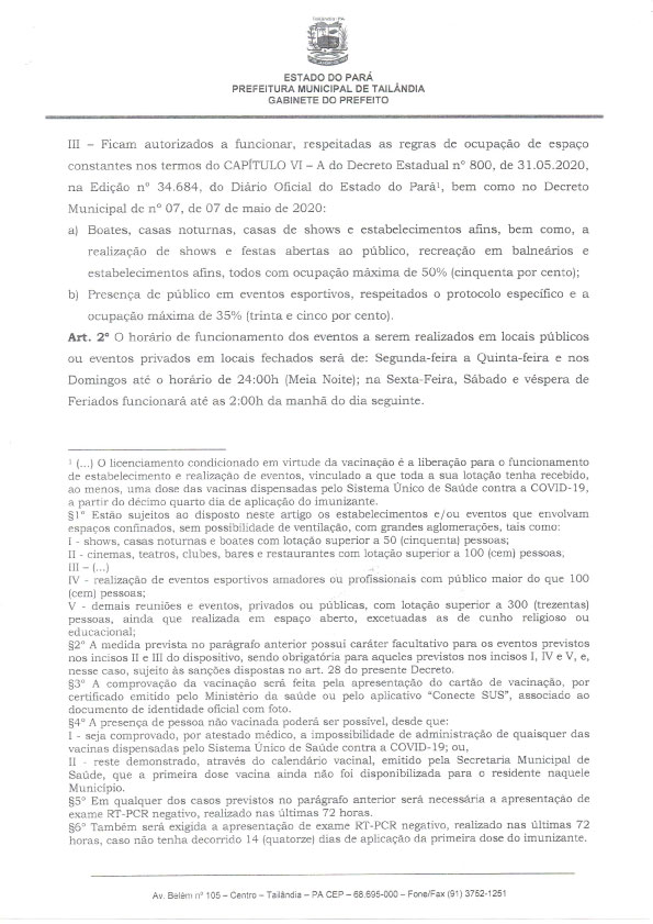 - Ficam autorizados a funcionar, respeitadas as regras de ocupação de espaço constantes nos termos do CAPÍTULO VI – A do Decreto Estadual n° 800, de 31.05.2020, na Edição n° 34.684, do Diário Oficial do Estado do Pará, bem como no Decreto Municipal de n° 07, de 07 de maio de 2020: a) Boates, casas noturnas, casas de shows e estabelecimentos afins, bem como, a realização de shows e festas aberta ao público, recreação em balneários e estabelecimentos afins, todos com ocupação máxima de 50% (cinquenta por cento); b) Presença de público em eventos esportivos, respeitados o protocolo específico e a ocupação máxima de 35% (trinta e cinco por cento).