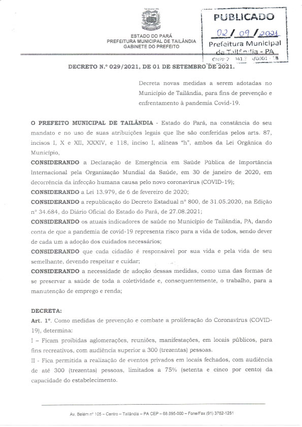 Foi assinado e publicado nesta quarta-feira (01) pelo prefeito Paulo Liberte Jasper (Macarrão), o novo Decreto nº 29/2021 que flexibiliza, principalmente, o horário de funcionamento de bares, restaurantes e conveniências em Tailândia.