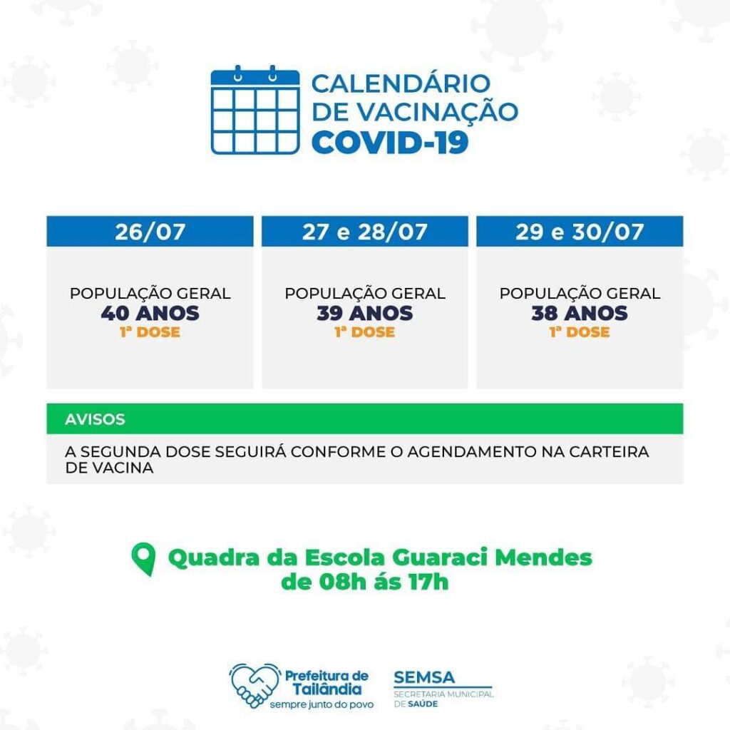 O processo de vacinação no município de Tailândia, nordeste paraense, segue avançando e conforme informado pela Secretária Municipal de Saúde (SEMSA) a imunização, nesta quinta e sexta-feira, nos dias 29 e 30/07, será para a população em geral, com 38 anos.